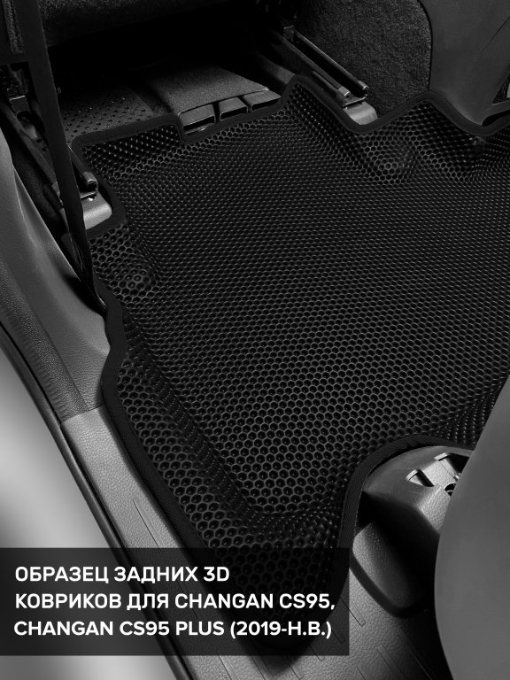 Автомобильные 3д коврики для Changan CS95 (2019-н.в.) в салон авто и багажник сделаны из инновационного полимерного материала EVA, изысканная структура в виде ячеек не дает воде, пыли и снегу разлетаться по салону машины и багажнику. 3д коврики зафиксированы на полу определенными клипсами, соответствующими Changan CS95 (2019-н.в.), и не двигаются в процессе езды.
